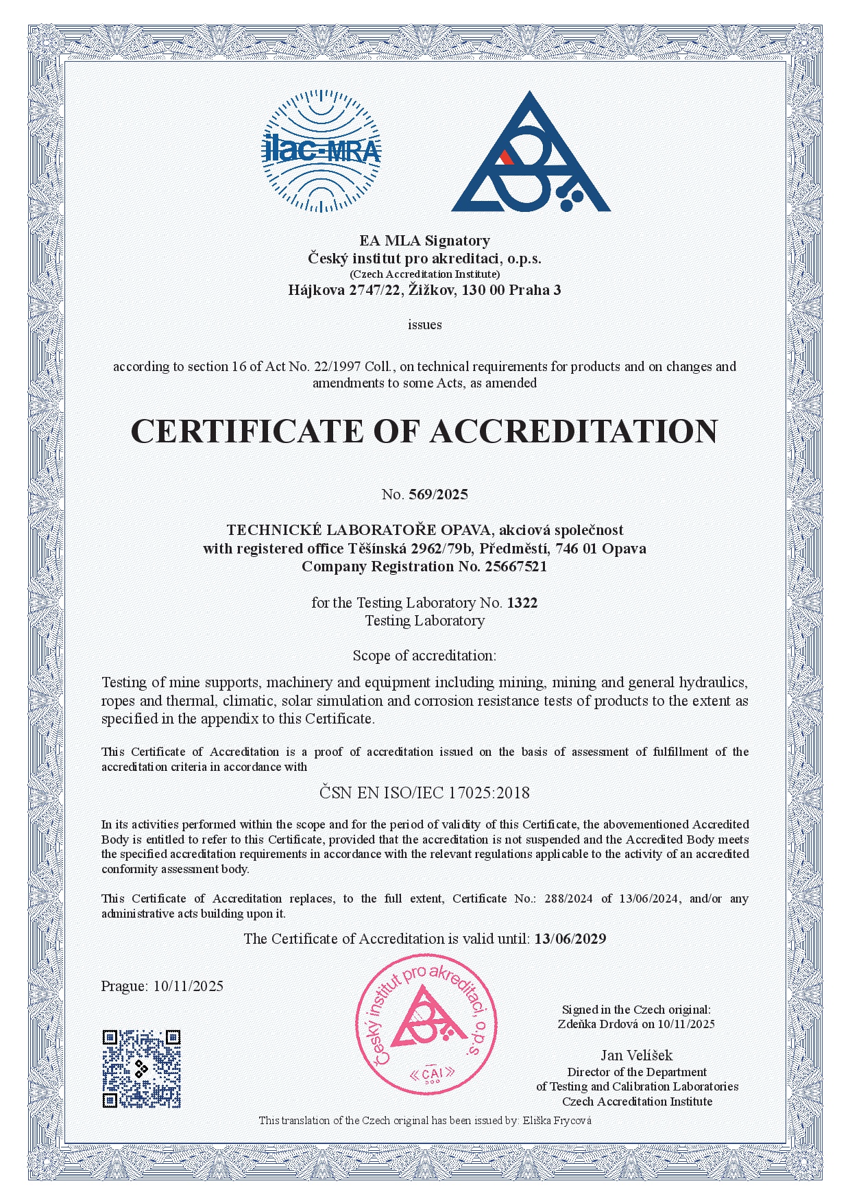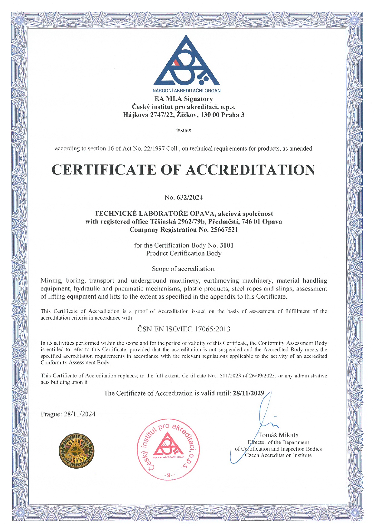 • Product Certification Body – accredited in accordance with ČSN EN ISO/IEC 17065, assesses machinery for mining, boring, transport and underground work, heavy equipment, material handling, hydraulic and pneumatic mechanisms, plastic products, steel ropes and fastening devices. It carries out assessments of lifting equipment and lifts.