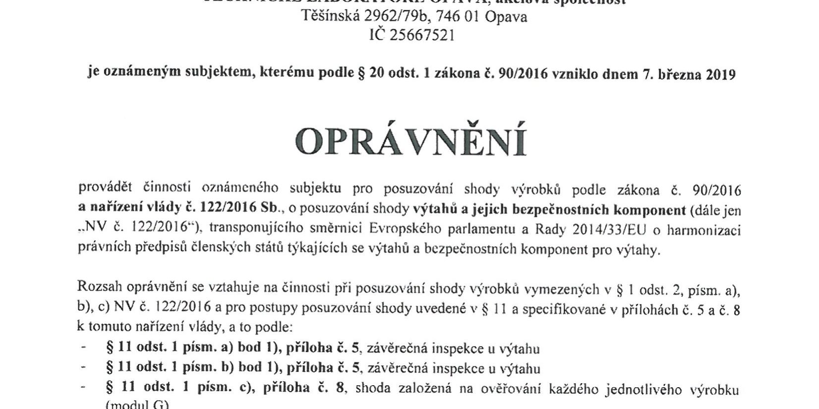 Získali jsme oprávnění provádět činnost oznámeného subjektu pro posuzování shody výrobků dle zákona č. 90/2016 Sb. a nařízení vlády č.122/2016 Sb., o posuzování shody a jejich bezpečnostních komponent.